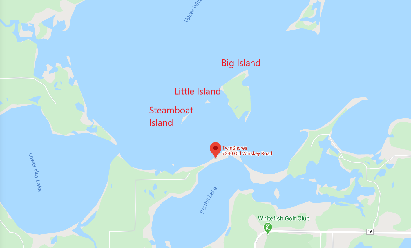 When looking out the North side of the cabin at Twin Shores you will see three islands. From left to right they are called Steamboat Island, Little Island, and Big Island.